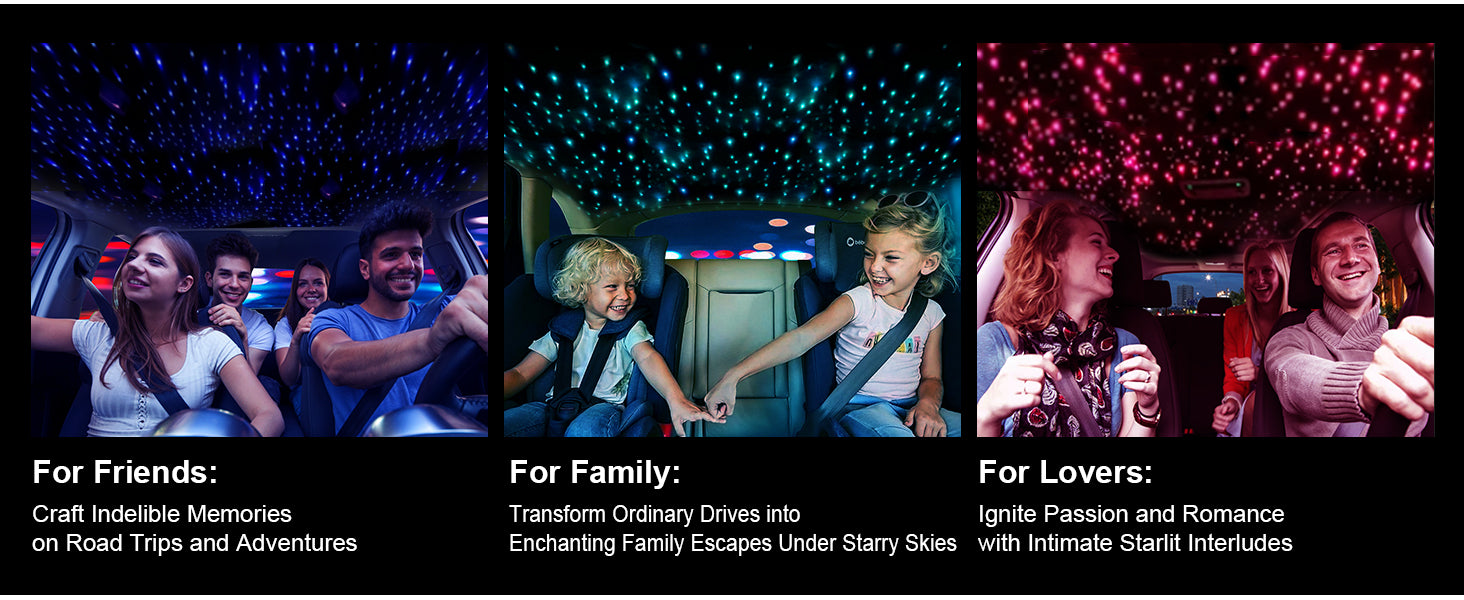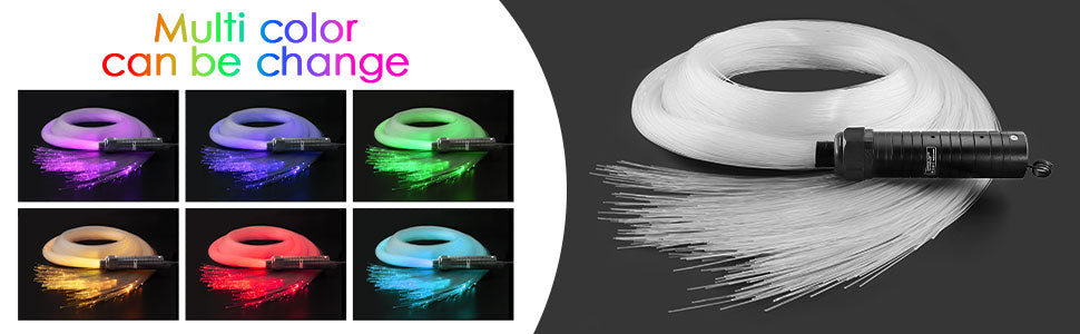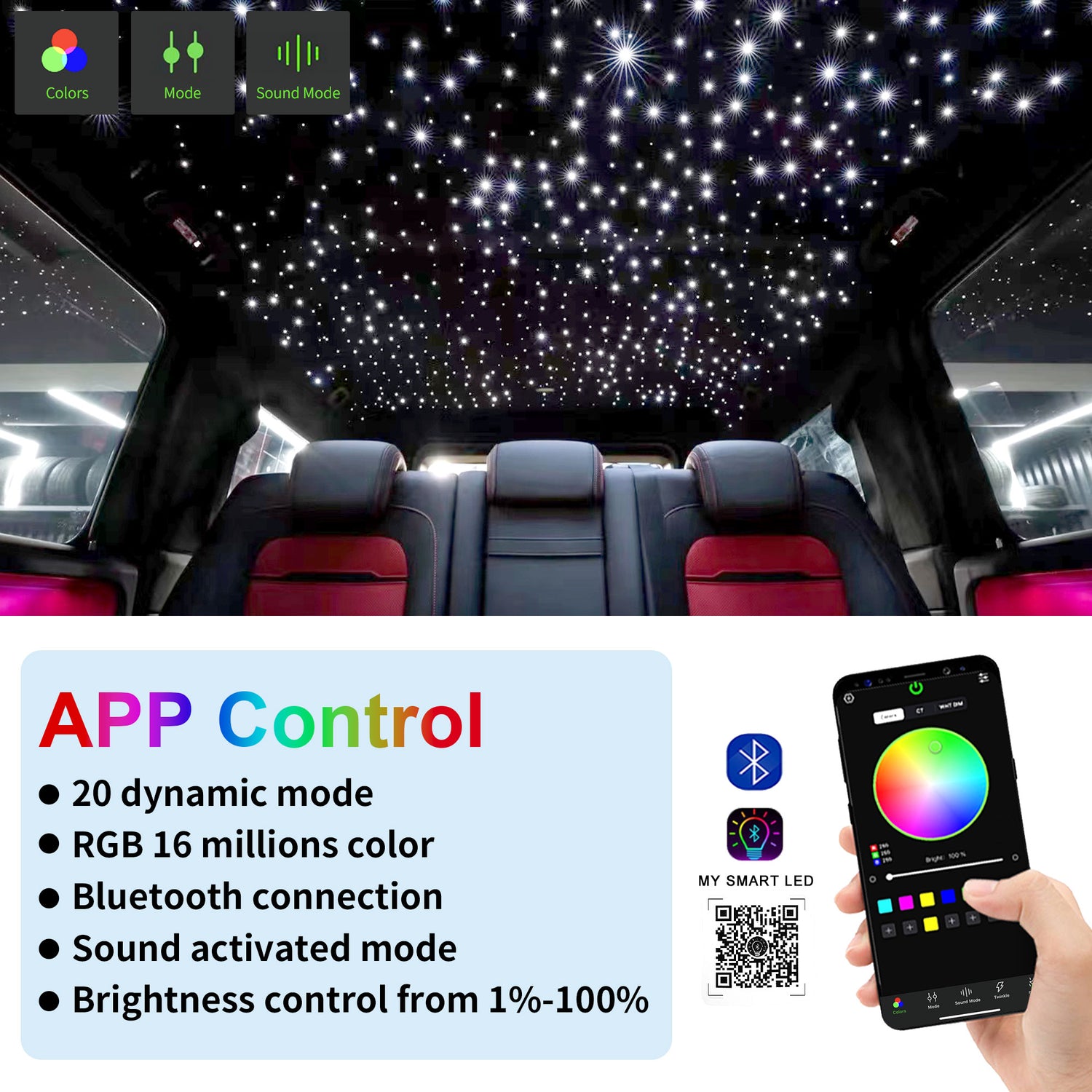 The end grow fiber optic strands are made of premium PMMA plastic, only transmit light, non-conductive, safer and energy saving. Car star lights can be controlled by RF remote and bluetooth APP, which has 16 static colors and sound activated mode, 6 dynamic effects and dynamic speed and static brightness adjustment, Give you a vivid and wonderful starry sky experience in the car.