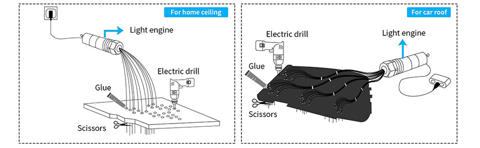 Star ceiling lights kit is perfect for car ceiling decor use, Also good for decorating home theater, bedroom, living room, party, restaurant, bar and so on, Good to DIY any pattern according to the quantity of the fiber