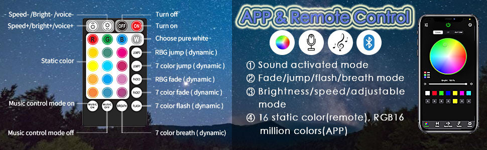 Star lights for car features music mode, The lights will change based on the music and beats playing, Enjoy the dynamic music and flashing light atmosphere in the car, Remote has 16 static colors and APP has RGB 16 millions colors, Multi color can be changed
